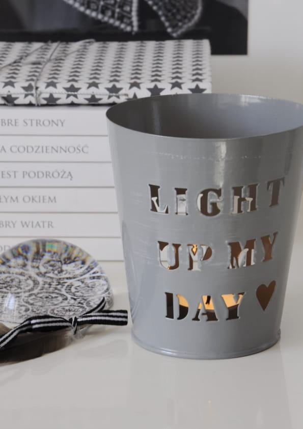 Szary lampion z wyciętym tekstem – dekoracyjny dodatek do wnętrz i ogrodu
