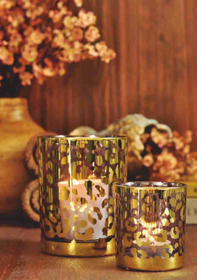 Zestaw szklanych lampionów w złote lamparcie cętki – elegancja i egzotyczny blask, który doda Twojemu wnętrzu wyjątkowego charakteru.