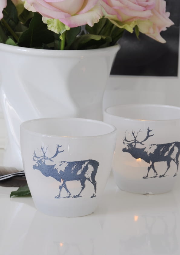 Świecznik z matowego szkła z reniferem – elegancja w czerni i bieli