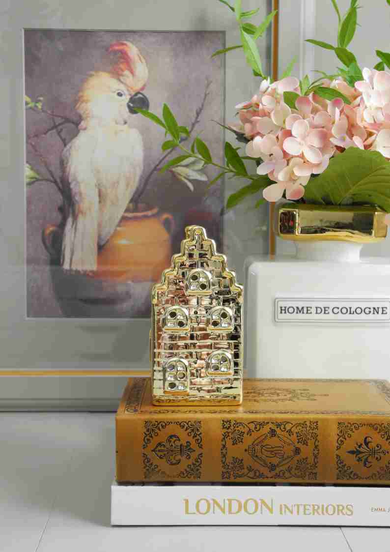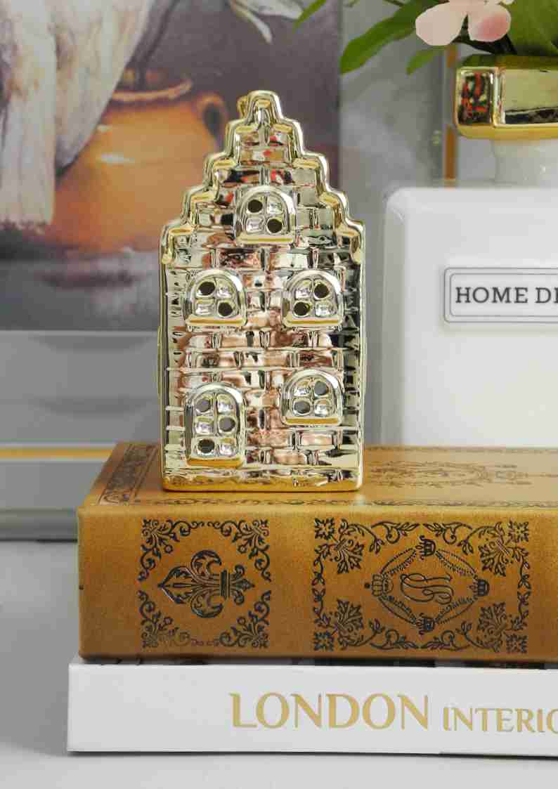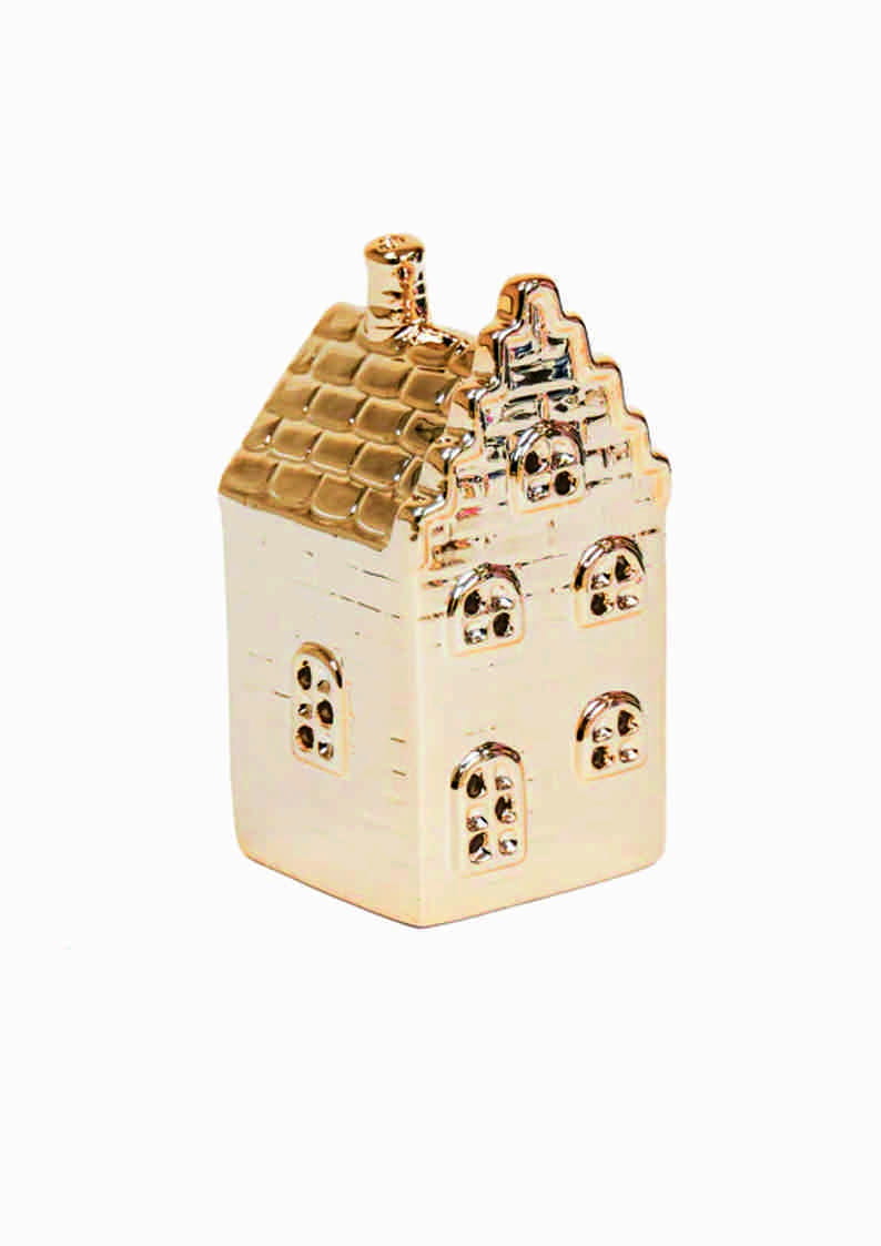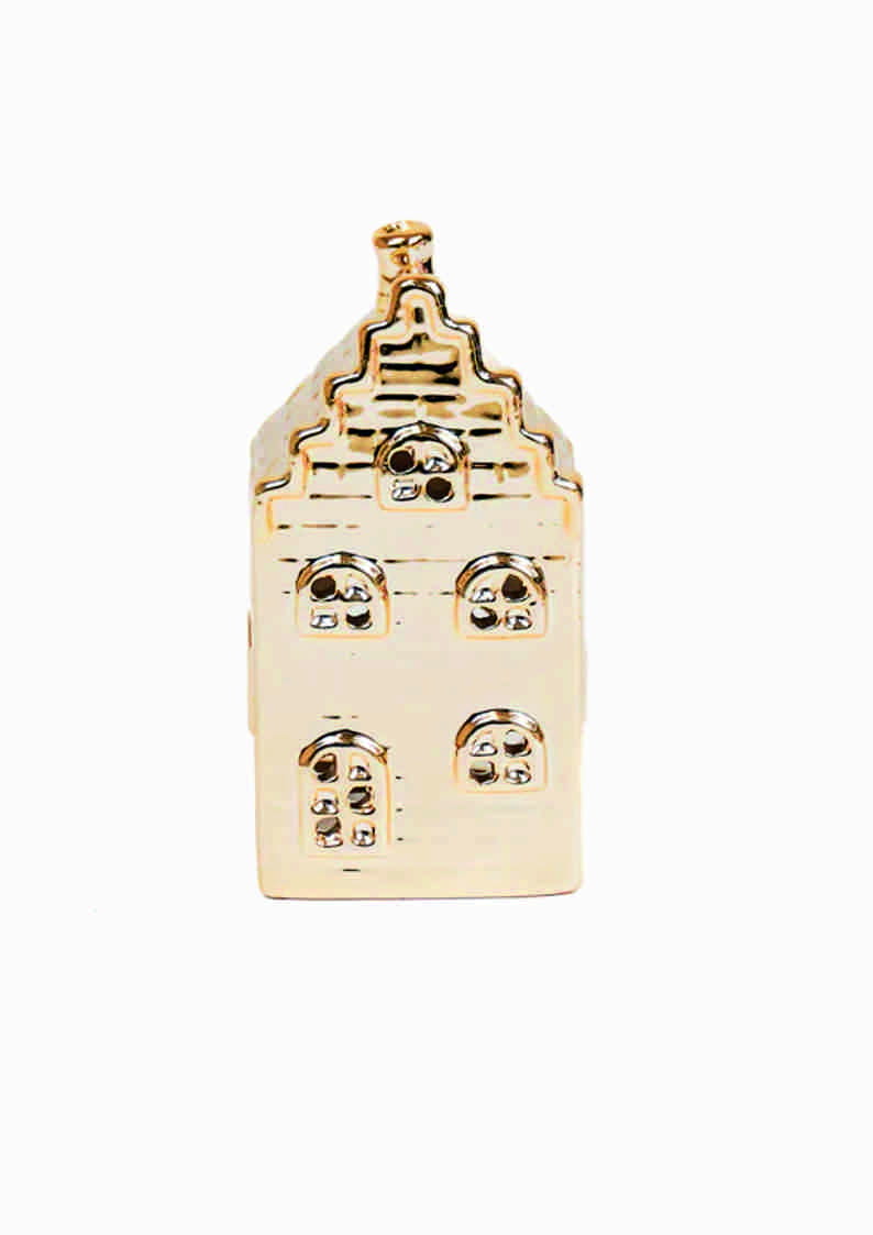Urokliwy lampion w kształcie holenderskiej kamieniczki z Amsterdamu to wyjątkowy element dekoracyjny, który wprowadza do wnętrza ciepło i przytulność. Wykonany jest z ceramiki. Złoty kolor dodaje mu elegancji i luksusowego charakteru. Ważne: używaj wyłącznie światła LED. Nie nadaje się do zapalonego tealighta.