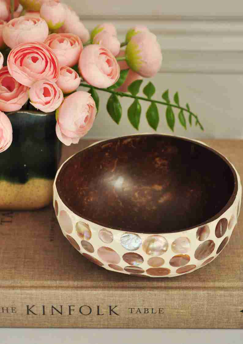 Miska z łupiny kokosa jest lekka, trwała i przyjazna dla środowiska, co sprawia, że jest nie tylko estetyczna, ale także ekologiczna. Środek w kolorze naturalnym, typowym dla skorupy orzecha kokosowego. Od zewnątrz została ona ozdobiona masą perłową, co nadaje jej wyjątkowego blasku i delikatnego połysku.Te perłowe elementy nadają jej elegancji i subtelnego blasku, co sprawia, że miseczka staje się nie tylko praktycznym przedmiotem, ale również artystycznym dziełem. Masa perłowa jest delikatna, tworząc efekt subtelnych refleksów świetlnych, co dodaje wyjątkowego uroku.