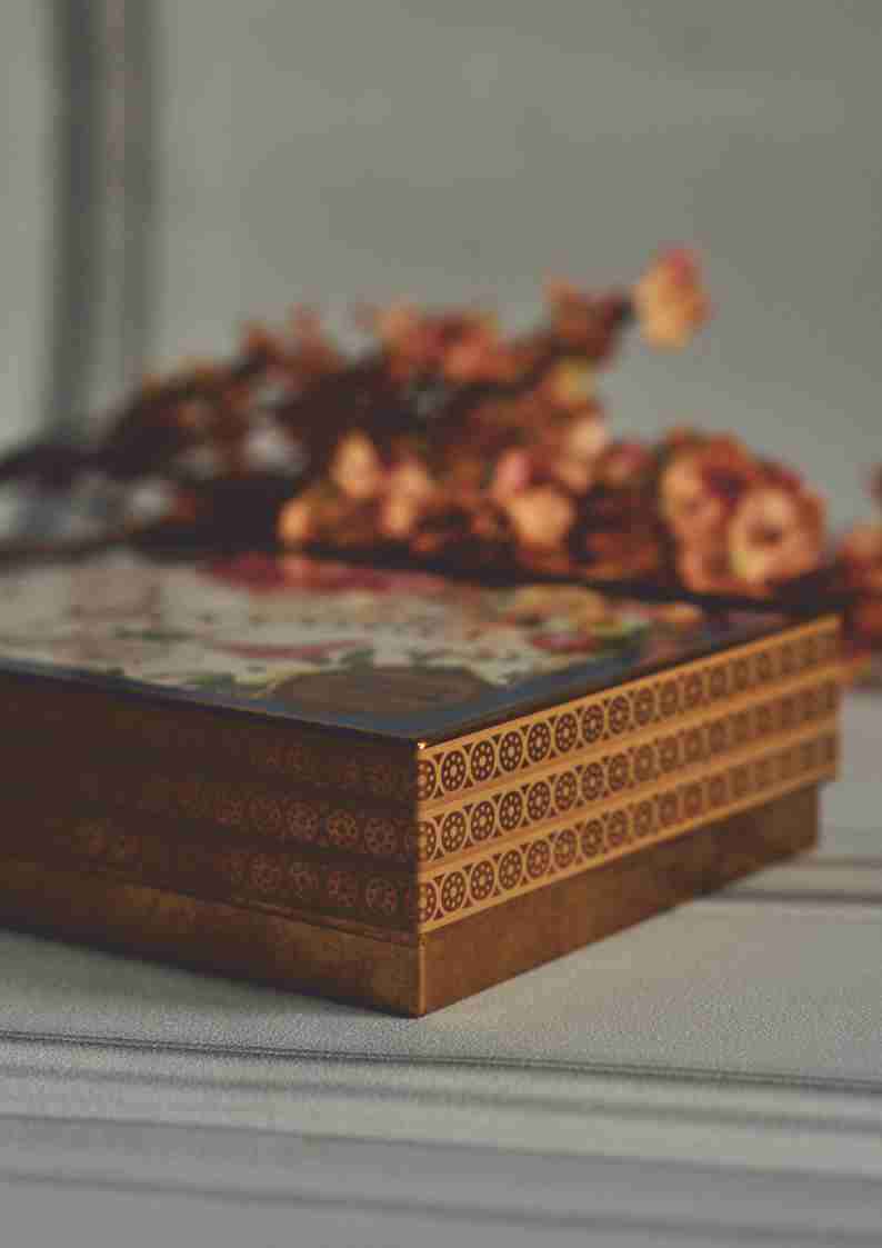 Boki puszki zdobią wyjątkowe wzory, nawiązujące do klasycznego stylu art deco. Metalowa powierzchnia puszki emanuje elegancją, a bogactwo detali sprawia, że stanowi ona wyjątkowy element dekoracyjny.