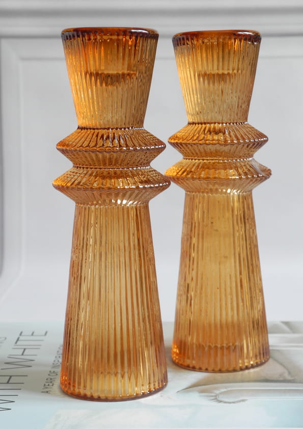 Karbowany świecznik z bursztynowego szkła – efektowna dekoracja do salonu