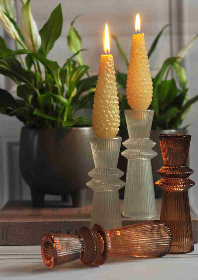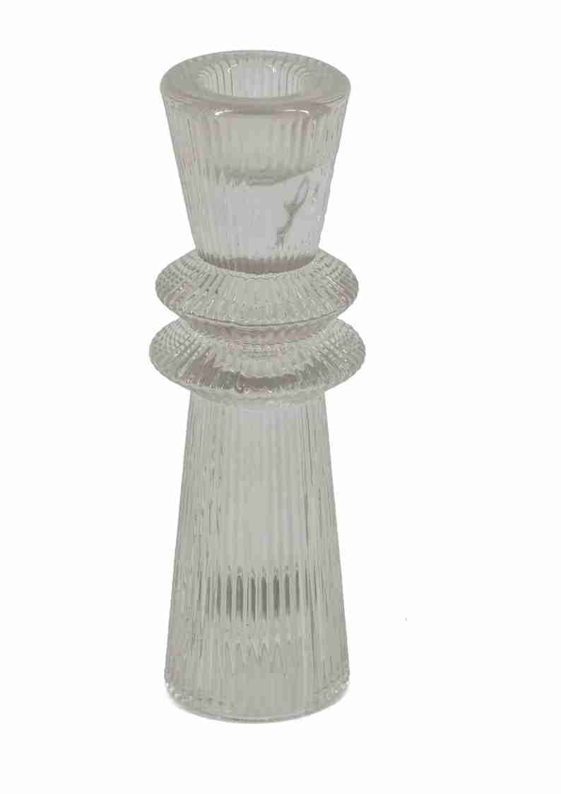 Wysoka forma i przezroczysta faktura czynią z tego świecznika perfekcyjny element do dekorowania stołu, półki lub komody. Idealny do zestawów – możesz połączyć go z innymi świecznikami lub wazonami, tworząc harmonijną kompozycję pełną światła i spokoju.